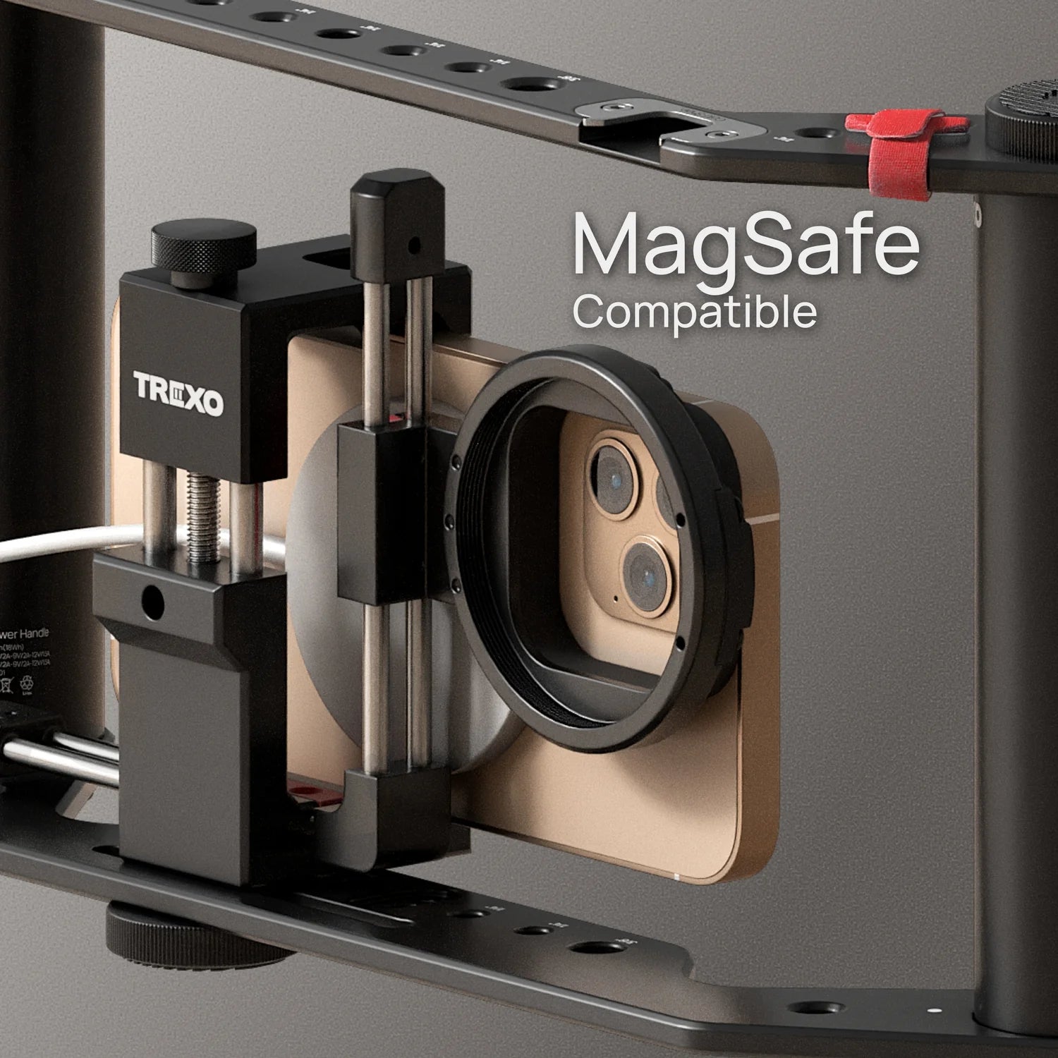 Our special phone holder design allows space for a MagSafe charger while keeping a black light-proof rubber seal around your phone's cameras. You can also use your favourite phone case while operating!