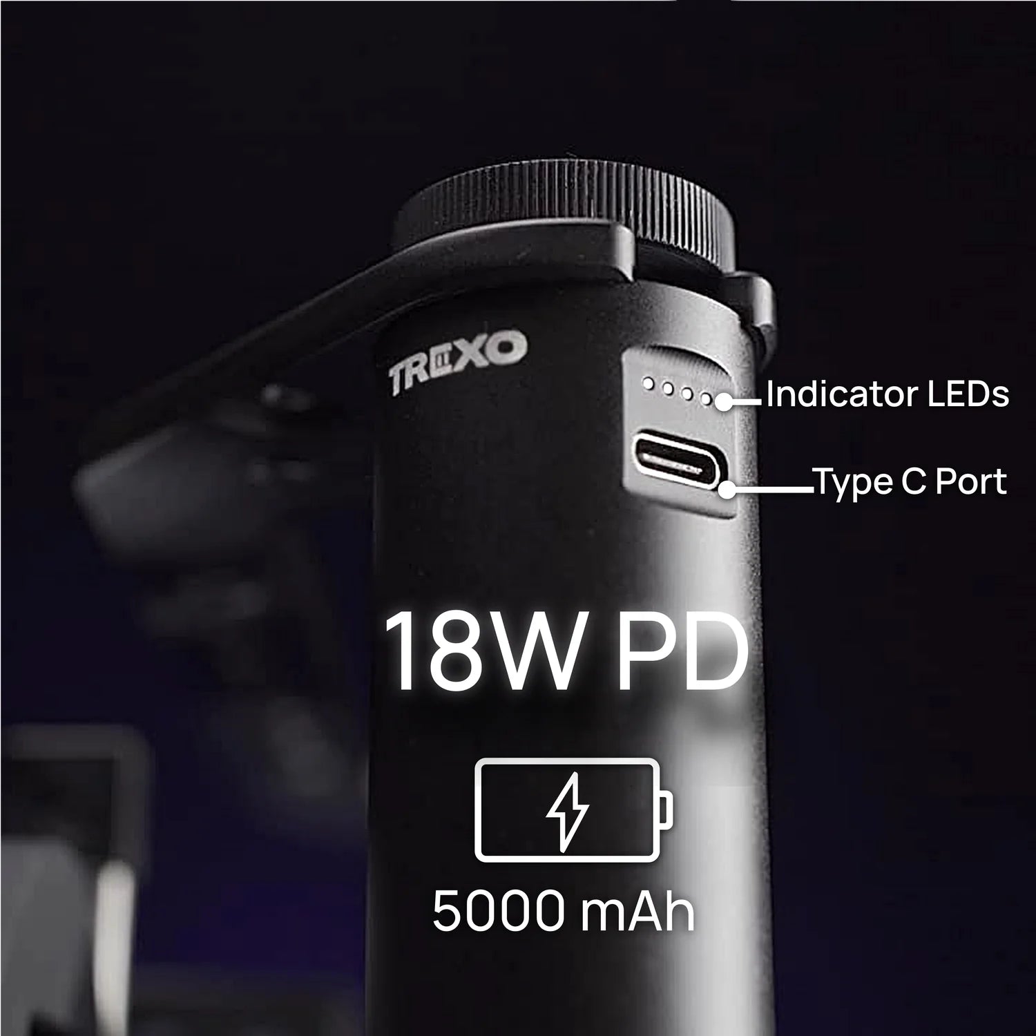Trexo Rig-it lets you have additional shooting time with a built in battery hidden neatly inside its handle. 5000mAh total battery capacity USB-C port in the handle allows charging/powering compatible devices Battery level indicator lights show charge level at a quick glance